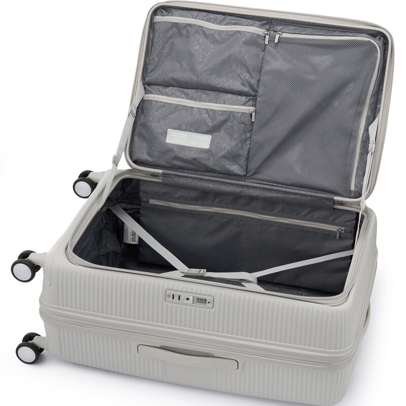 Elevated design and function. American Tourister Curio Book Opening luggage combines the practicality of a soft case with the toughness of a hard case. It features huge packing volume with expandability in all sizes. The Duosaf ™ security zipper delivers top security, and the Optimov™ shock-absorbing wheels allow smooth rolling on bumpy surfaces. The recycled interior lining is treated with Microban® technology to eliminate the growth of bacteria.
