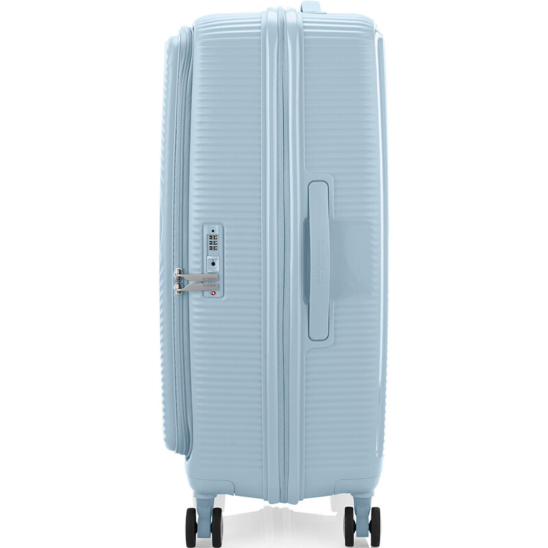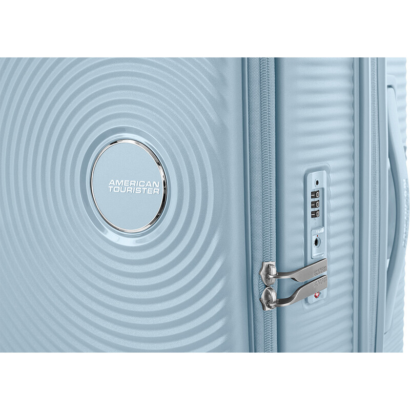Elevated design and function. American Tourister Curio Book Opening luggage combines the practicality of a soft case with the toughness of a hard case. It features huge packing volume with expandability in all sizes. The Duosaf ™ security zipper delivers top security, and the Optimov™ shock-absorbing wheels allow smooth rolling on bumpy surfaces. The recycled interior lining is treated with Microban® technology to eliminate the growth of bacteria.