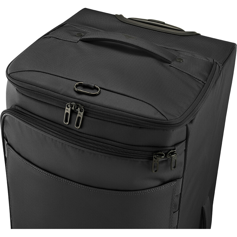 - Smooth rolling wheels are inset into corner-mounted wheel housings