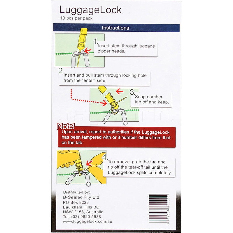 LuggageLock is a disposable tamper evident security seal designed for use with travel bags. Usage is simple - simply thread through the zipper heads, pull it tight through the locking hole. Break the number tab off LuggageLock and keep it safely for reference.