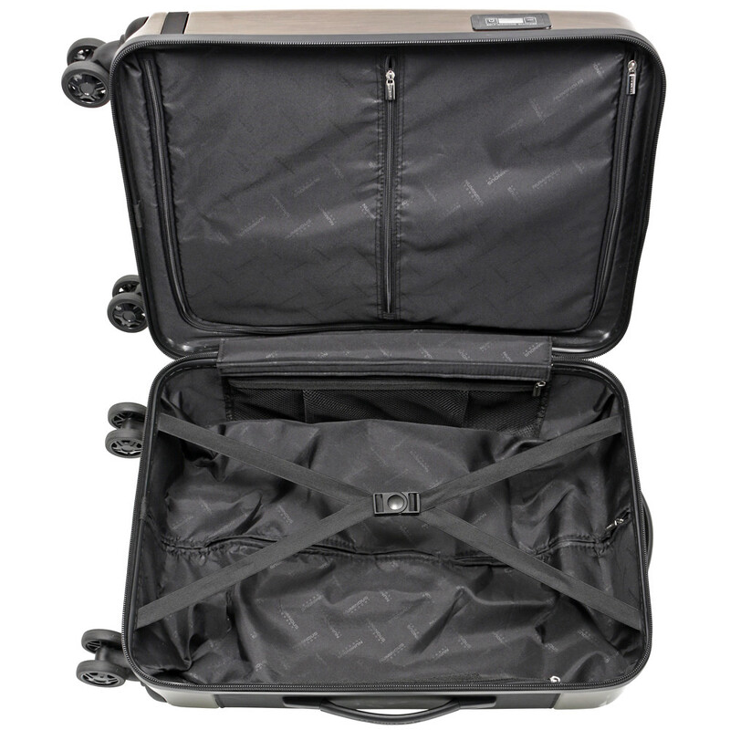 - Fully lined interior with adjustable packing straps, divider panel and zip pockets