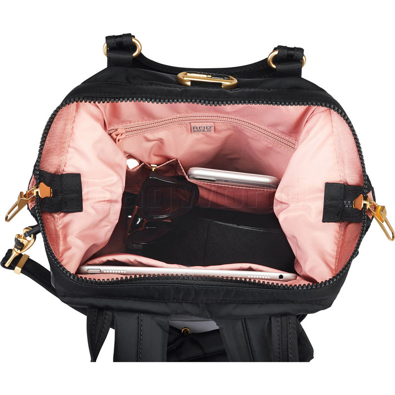 - Spacious main compartment with framed opening contains padded laptop/tablet sleeve and organisation panel with RFID blocking zippered pocket, sleeve pocket and pen sleeves