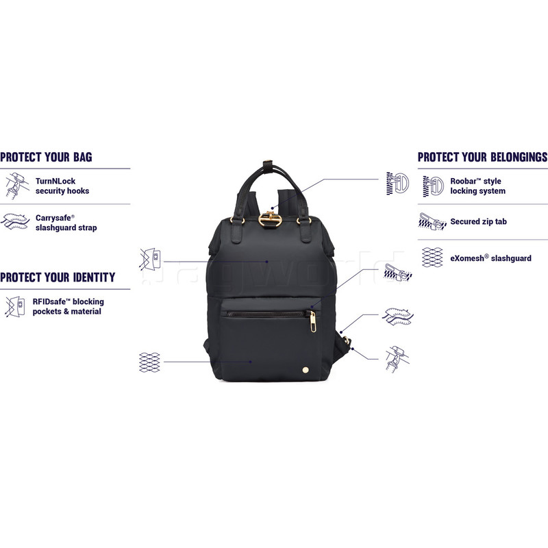 - eXomesh® slashguards – Front, bottom and side fabric body panels of the bag have built in stainless steel wire mesh panels