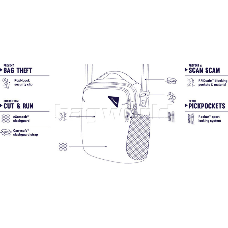 - eXomesh® slashguards - Front, bottom and side fabric body panels of the bag have built in stainless steel wire mesh panels