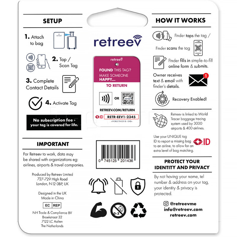 Retreev is the Smart Tag for your bag! Should a bag go missing, the Retreev Smart Tag will allow anyone to help get it back to its owner swiftly and securely. Identity theft is rising, and old baggage tags have your name, contact details and home address written in plain sight! No personal details are displayed on your Retreev tag. Every tag has a unique ID that is linked to a secure Retreev account. Made of reinforced stainless steel, a Retreev ring can withstand more than 50kg of force. The metal ring and eyelet have been engineered to keep the tag in place and attached to any bag, no matter what.