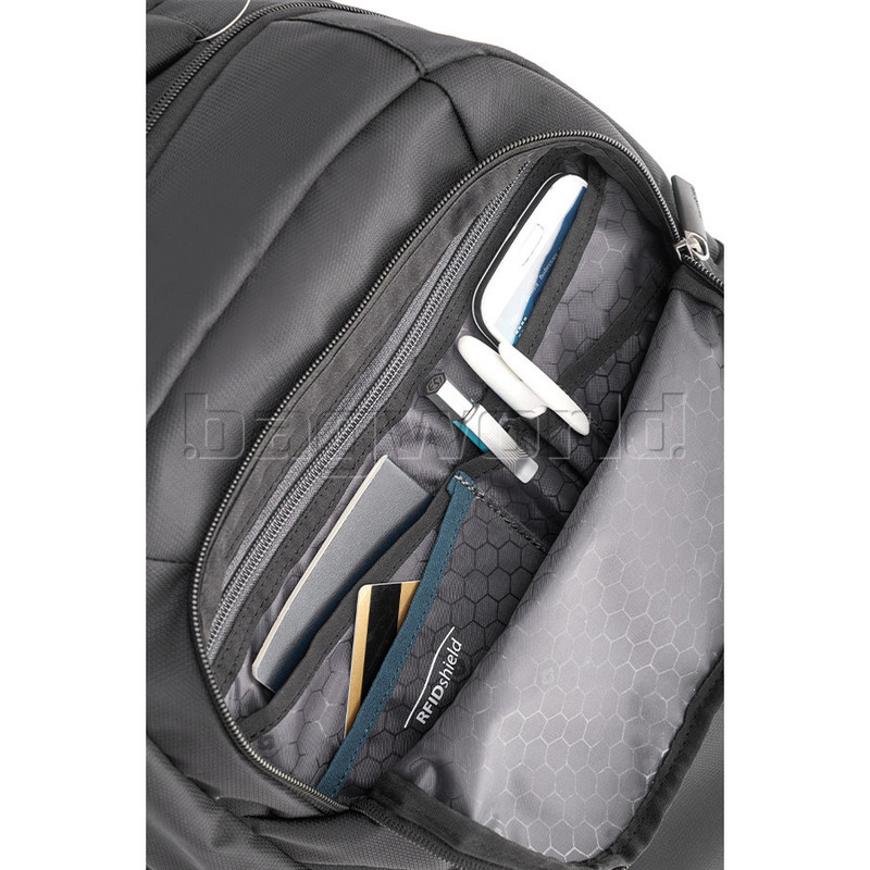 - Front pocket includes organiser panel with RFID blocking pocket that protects your credit cards and passport