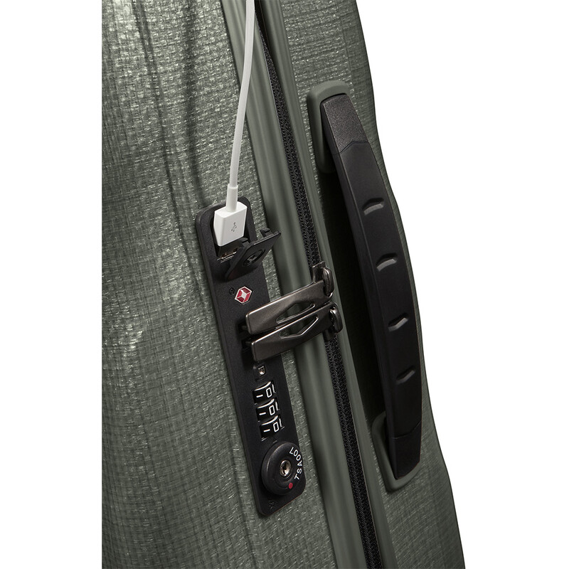 - USB charging port on side of suitcase with inbuilt power pack pocket inside (power pack not included)