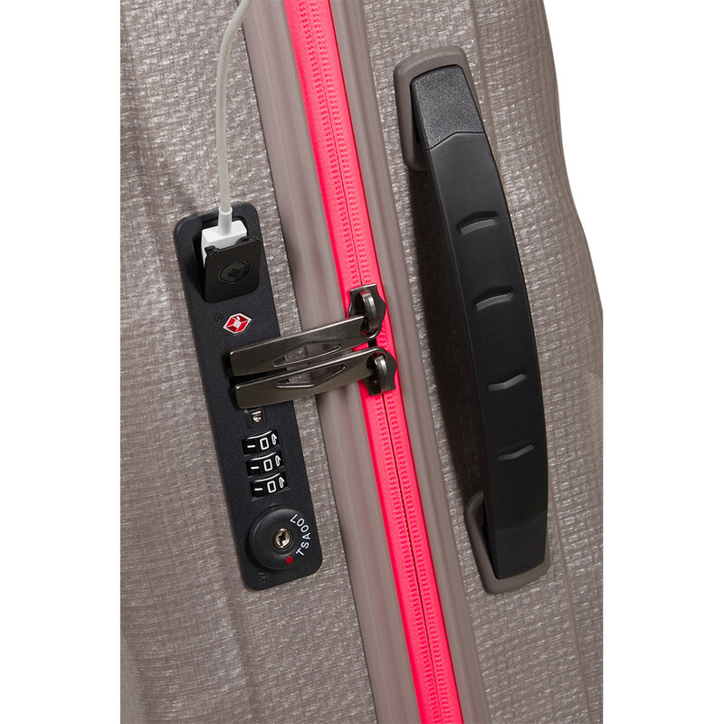 - USB charging port on side of suitcase with inbuilt power pack pocket inside (power pack not included)