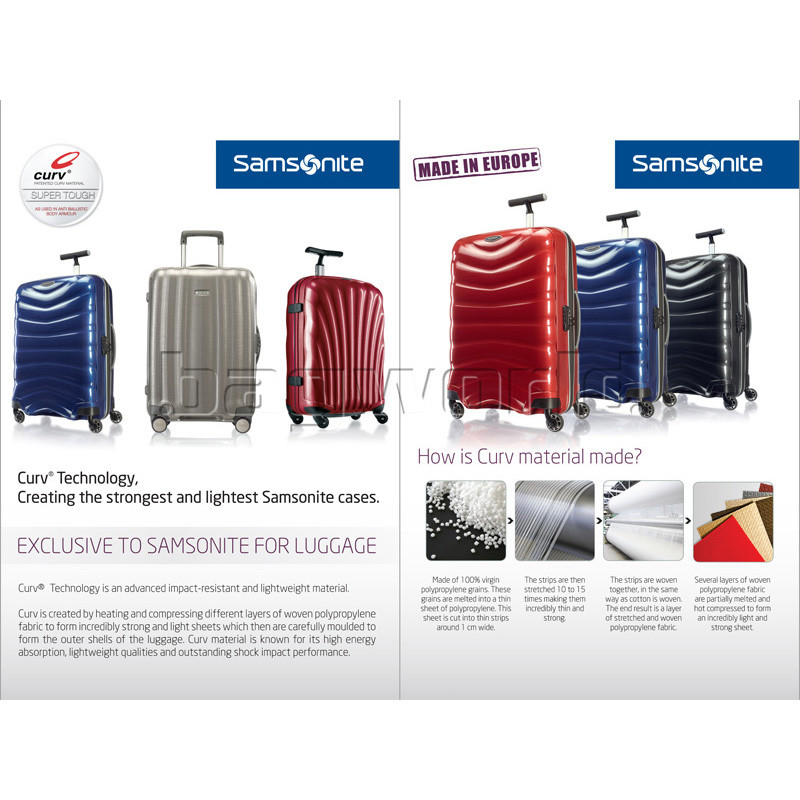 - Made with 100% Curv material, enabling a very strong but still extremely light suitcase. Curv material consists of a layer of woven polypropylene fabrics which are formed into self reinforced composite sheets. These sheets are lightweight, yet strong, and offer exceptionally high resistance to impact at ambient and very low temperatures. The shell design and process is patented by Samsonite