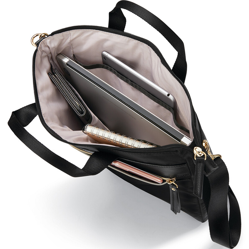 The Samsonite Mobile Solution range offers timeless style with a modern approach to function and organisation. Luxurious gold accent logos and zips elevate the collection. Slim and sophisticated, this multitasking brief offers a versatile alternative to the typical laptop bag. The SmartSleeve™ enables you to stack your bag on your suitcase for hassle-free travel.
