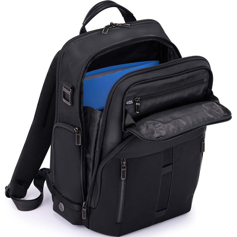 - Upper front pocket with zippered RFID compartment and outer zip accessory pocket