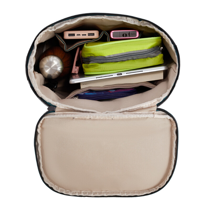 - Spacious main compartment has a wide opening with zip around flap