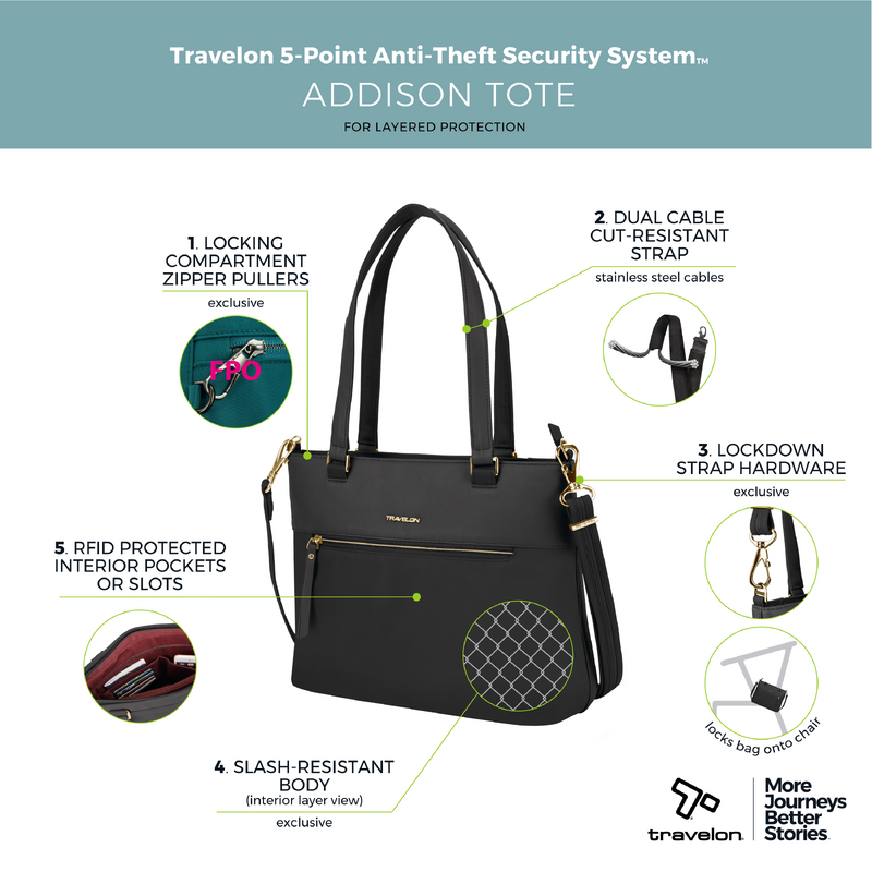 Sleek and stylish modern bags designed for living, working and traveling without limits, Travelon Addison balances urban fashion aesthetics with travel practicality. Quality construction and innovative textiles include sturdy nylon on the lower half and 100% vegan leather on the upper half of the bag. Thoughtfully organized to keep up with your day and the built-in 5-Point Anti-Theft security system will protect your valuables from pickpockets and thieves. Addison X Travelon. We carry your world.