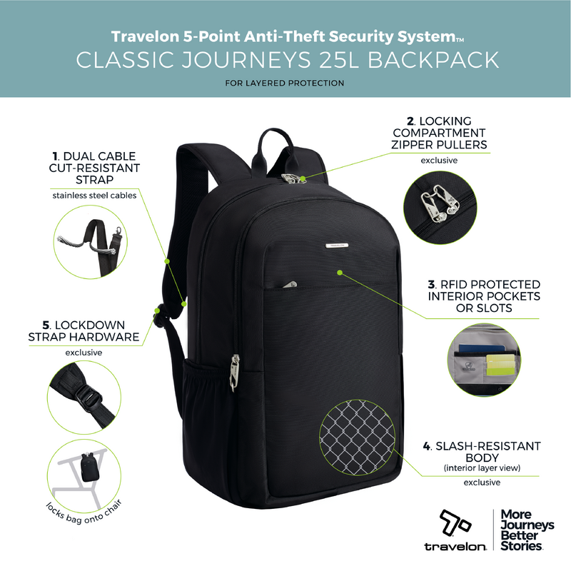 Main features of the Travelon Classic Anti-Theft 17” Laptop & Tablet 25L Backpack includes: