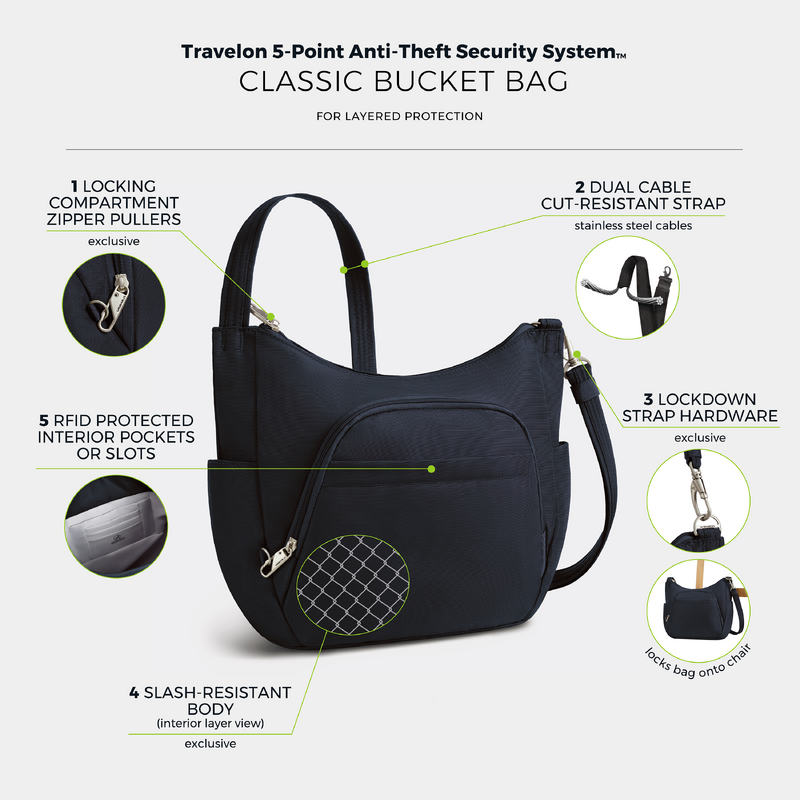Main features of the Travelon Classic Anti-Theft Crossbody Bucket Bag include: