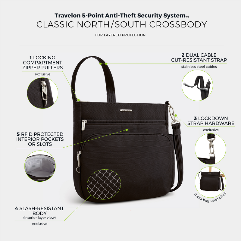 Main features of the Travelon Classic Anti-Theft North/South Crossbody Bag include: