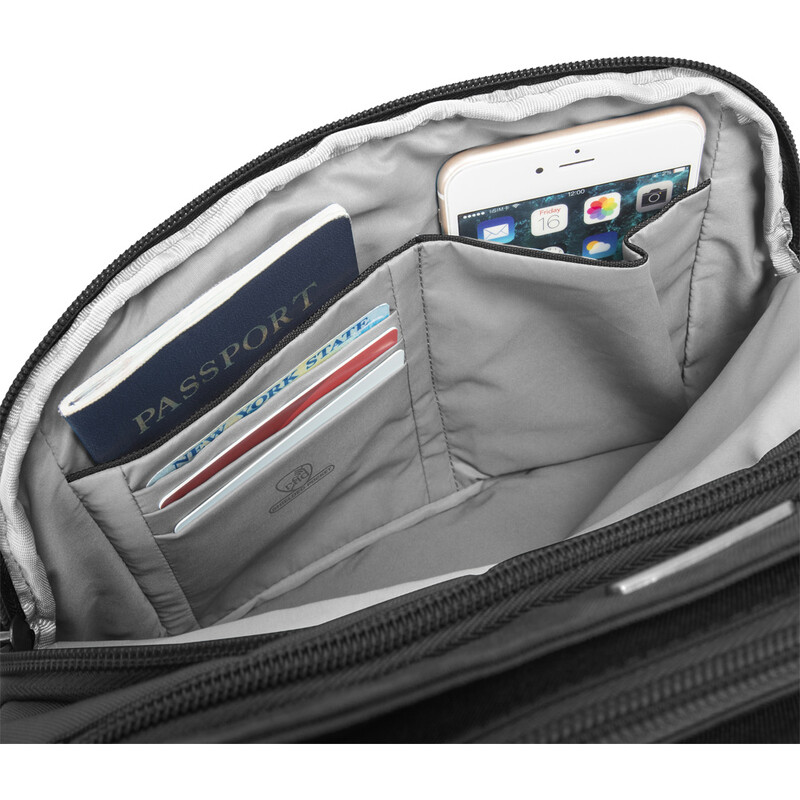 - Front organizer compartment has RFID blocking card and passport slots and 1 open pocket