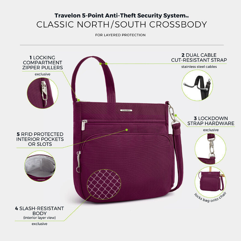 Main features of the Travelon Classic Anti-Theft North/South Crossbody Bag include: