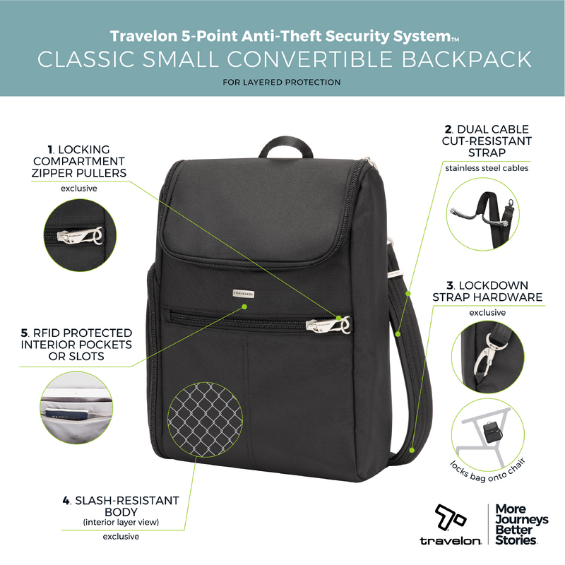 Main features of the Travelon Classic Anti-Theft Small Convertible Tablet Backpack include: