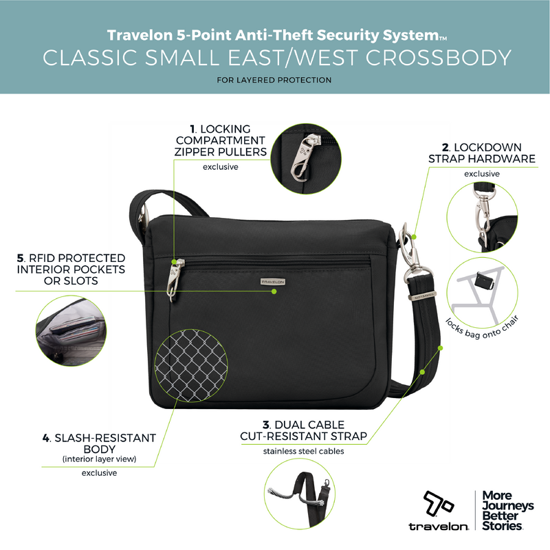 Main features of the Travelon Classic Anti-Theft Small East/West Crossbody Bag include: