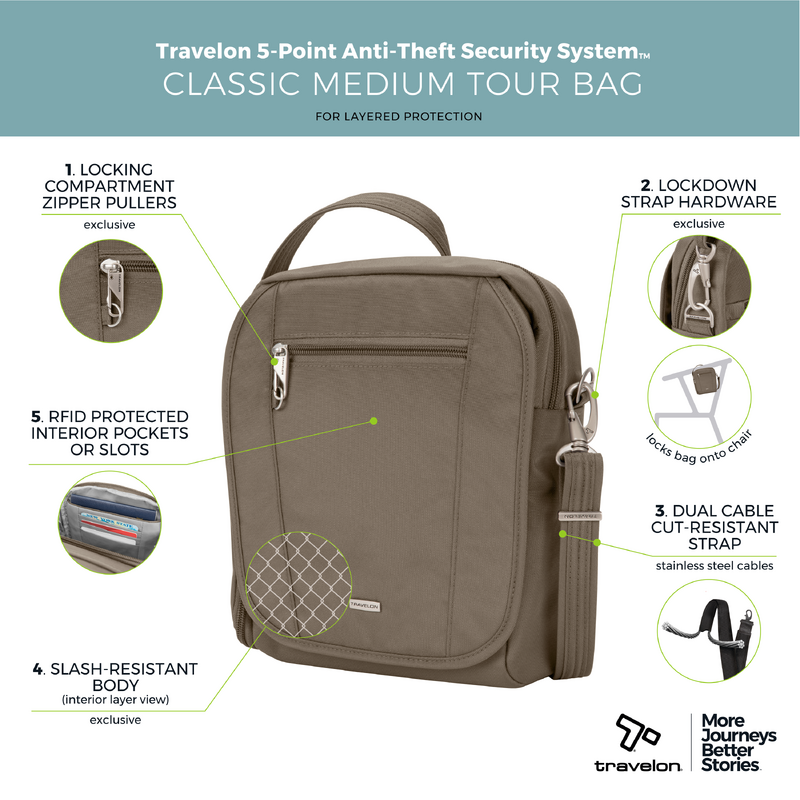 Main features of the Travelon Classic Anti-Theft Tablet Medium Tour Bag include: