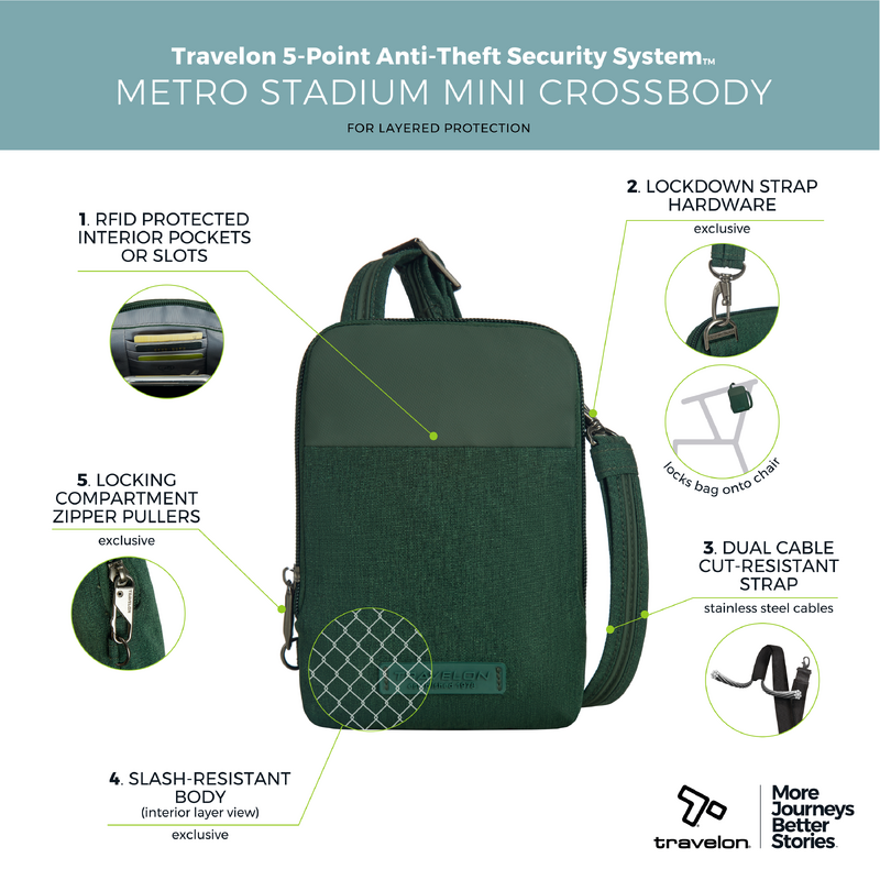 Main features of the Travelon Metro Anti-Theft Stadium Mini Crossbody Bag include: