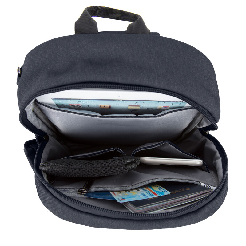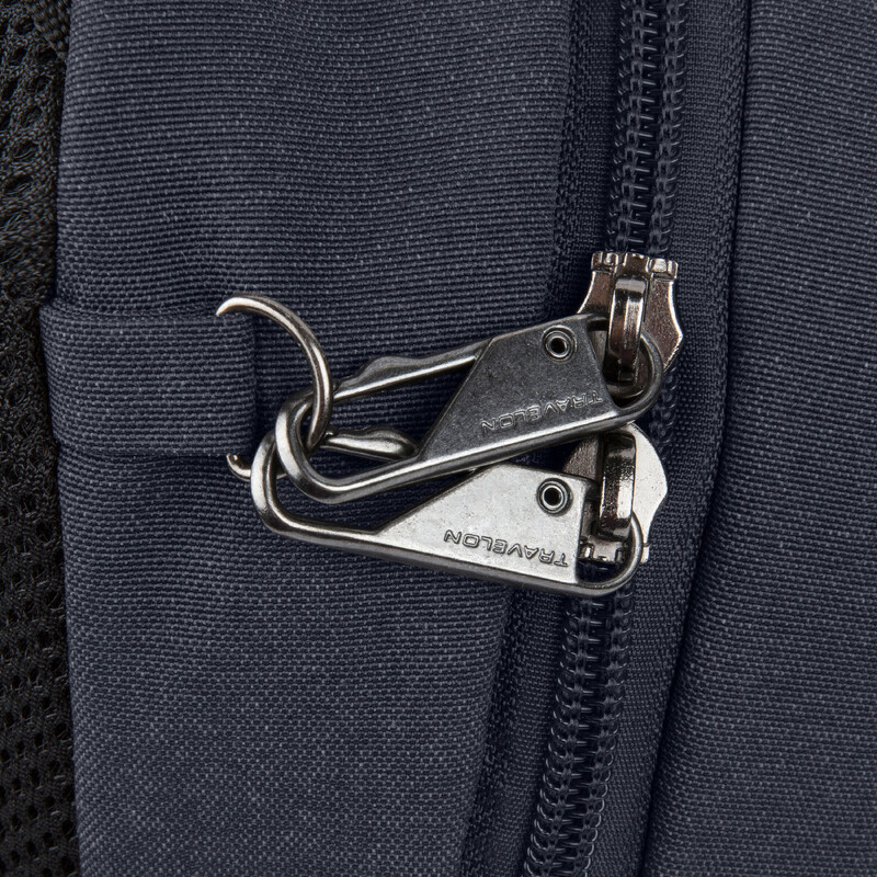 - Full Anti-Theft features include surround slash-resistant body panels and shoulder strap; locking compartments; lockdown strap