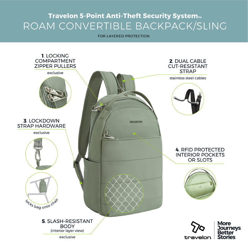 Main features of the Travelon Roam Anti-Theft Convertible Backpack/Sling include: