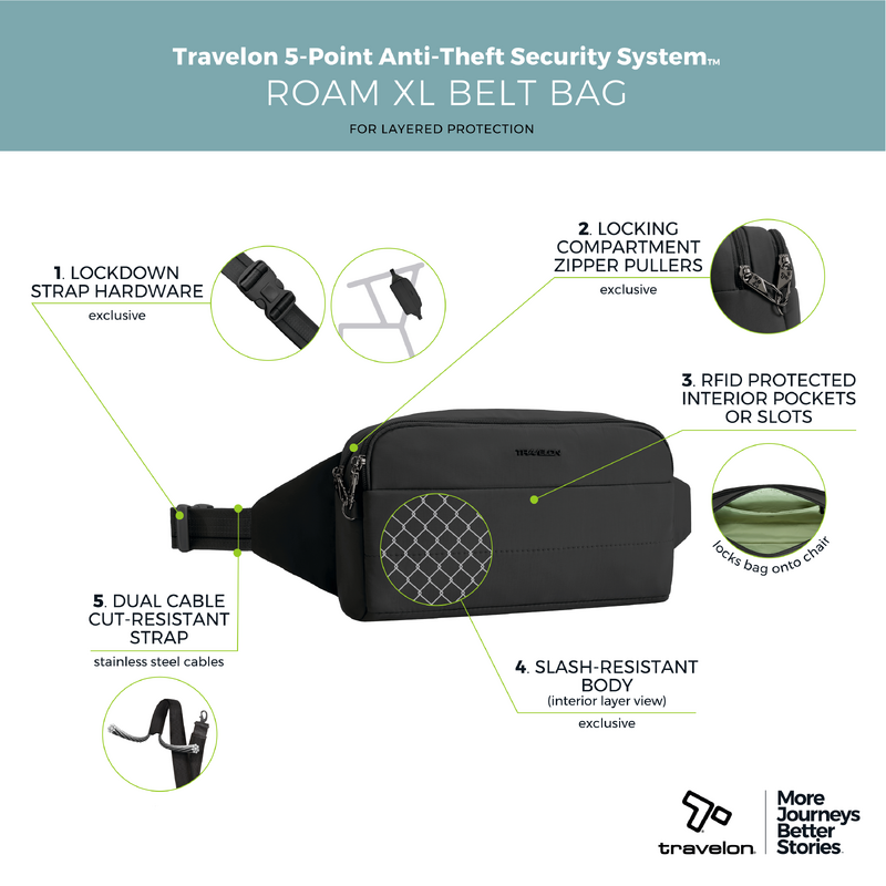 Main features of the Travelon Roam Anti-Theft XL Belt Bag include: