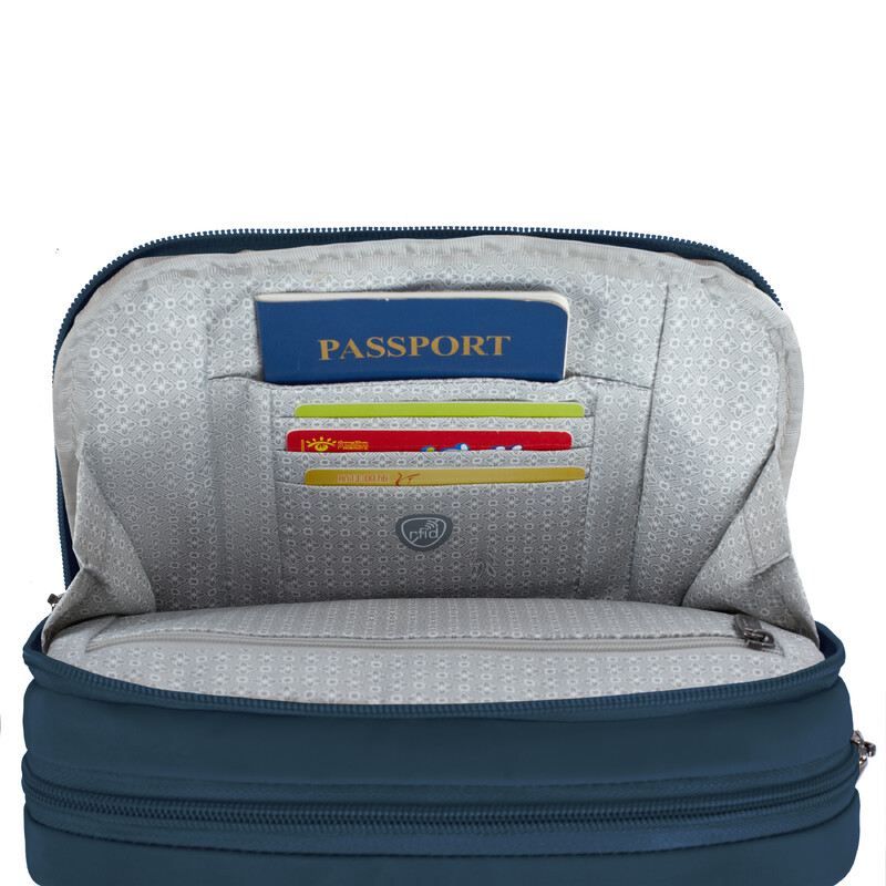 - Front compartment organisational panel with RFID blocking card slots, RFID blocking passport pocket & small zippered pocket