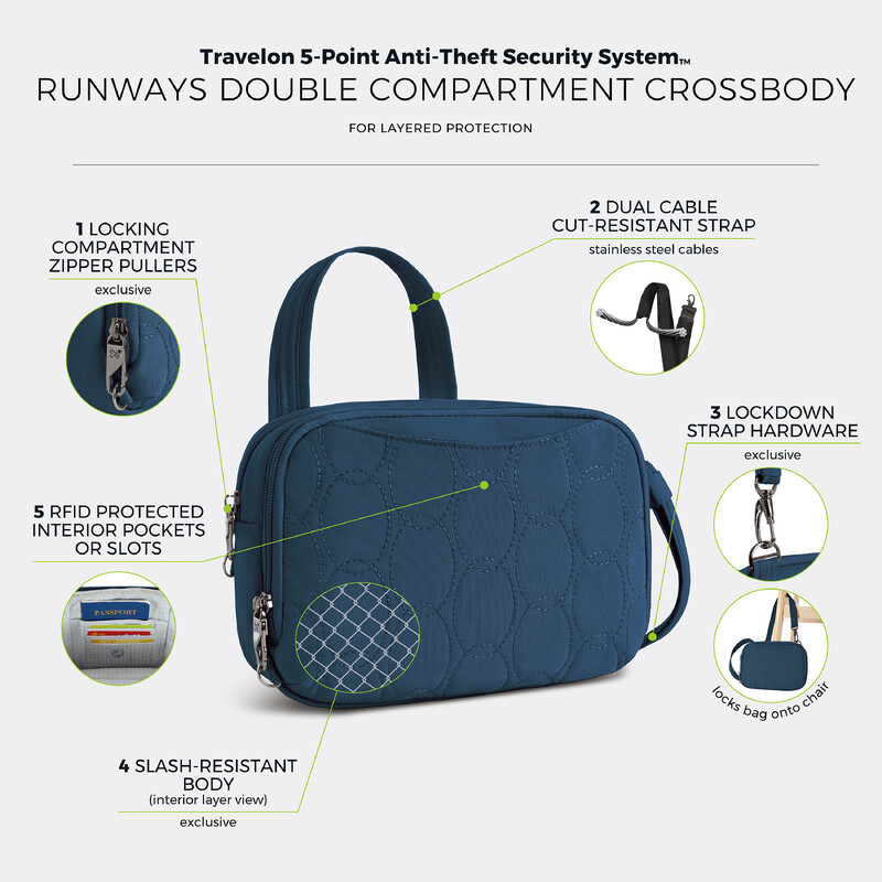 Main features of the Travelon Runways Anti-Theft Double Compartment Crossbody include: