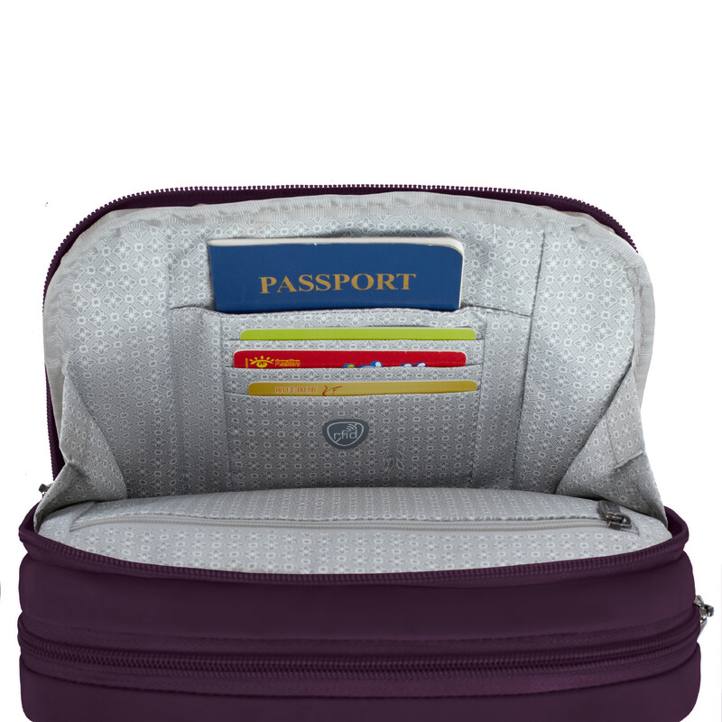 - Front compartment organisational panel with RFID blocking card slots, RFID blocking passport pocket & small zippered pocket