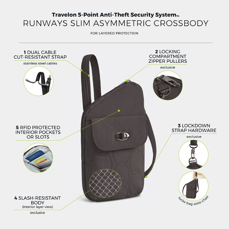 Main features of the Travelon Runways Anti-Theft Slim Asymmetric Crossbody include: