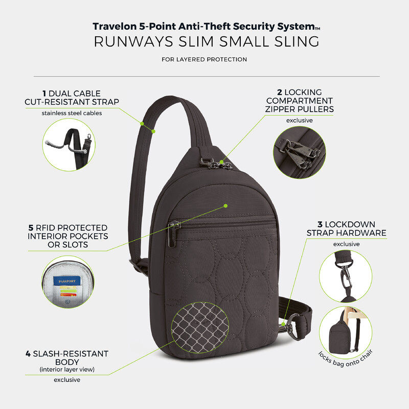 Main features of the Travelon Runways Anti-Theft Small Sling include: