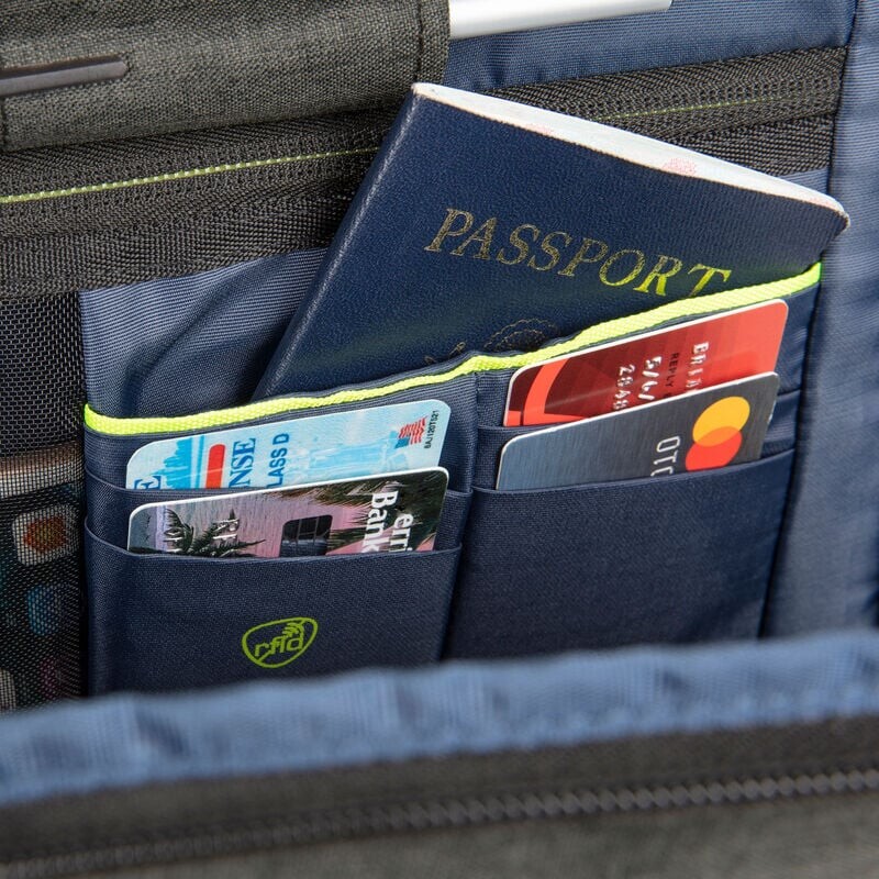 - 5-Point Anti-Theft security system: Slash-resistant mesh barrier in all 4 sides and bottom body panels; slash-resistant strap and lock-down strap feature; locking compartments; and RFID blocking organizer