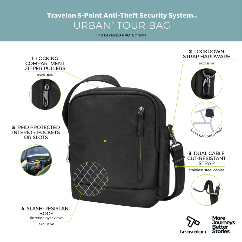 Main features of the Travelon Urban Anti-Theft Tour Bag include: